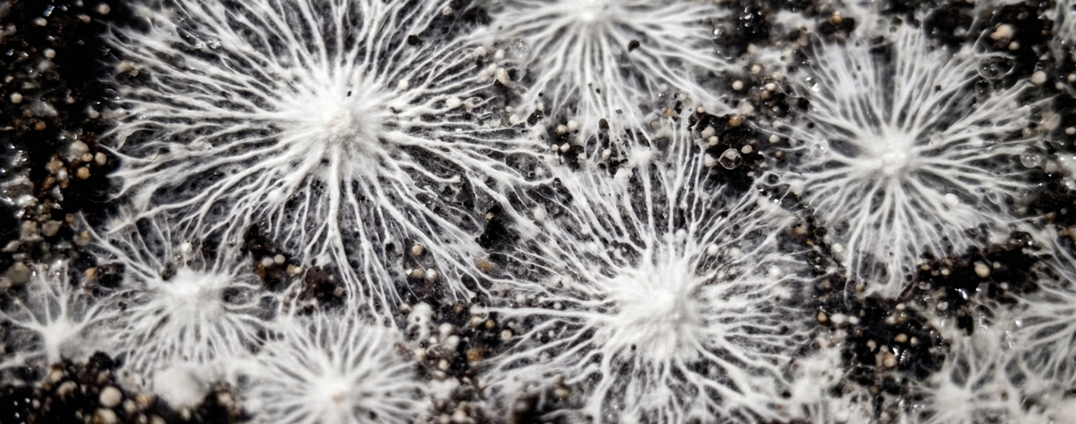 Estos patrones emergen del crecimiento simultáneo de miles de hifas que exploran el entorno en busca de nutrientes.